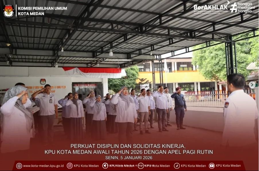 #TemanPemilih, KPU Kota Medan melaksanakan Apel Pagi Rutin di halaman Kantor KPU Kota Medan, Jl. Kejaksaan No. 37 Medan, Senin (5/1/2026).