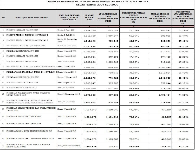 Ada fakta yang menarik bahwa trend kehadiran Pemilh di Kota Medan pada setiap Pemilihan kepala daerah, baik itu Gubernur dan Wakil Gubernur maupun Walikota dan Wakil Walikota cendrung menurun dengan catatan bahwa kehadiran Pemilih di Pilwako Medan lebih rendah di bandingkan dengan Pilgub. Sebaliknya kehadiran Pemilih dalam Pemilu (Presiden dan Wakil Presiden maupun Legislatif) relative lebih tinggi bila dibandingkan dengan Pemilihan Kepala Daerah sebagaimana tampilan matriks di bawah ini :