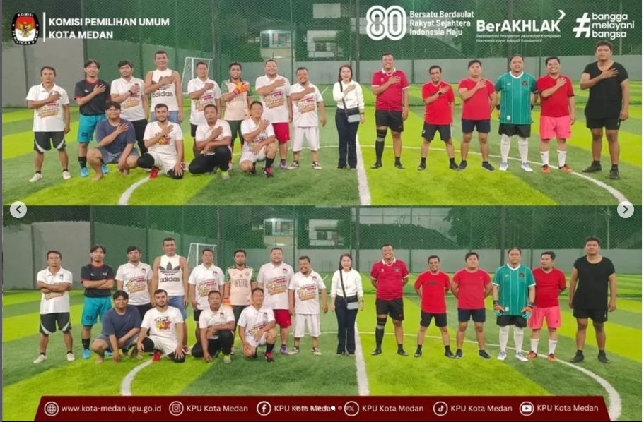 Pertandingan Persahabatan Mini Soccer antara KPU Kota Medan dengan Bawaslu Kota Medan dalam rangka menyemarakkan peringatan HUT ke-80 Kemerdekaan Republik Indonesia Tahun 2025, Sabtu (16/08/2025).