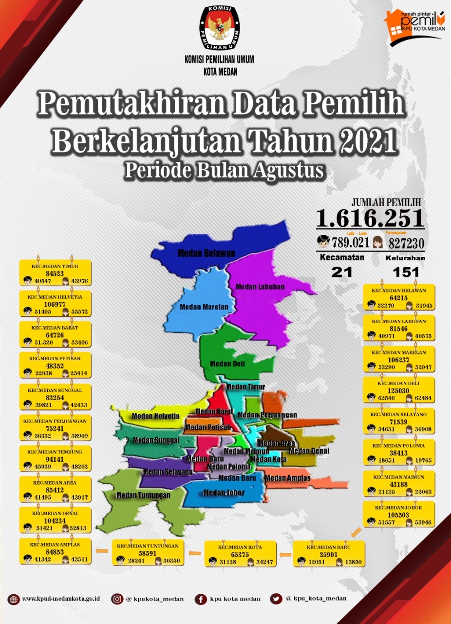 Rekapitulasi Daftar Pemilih Berkelanjutan dengan jumlah sebanyak 1.616.251 (Satu Juta Enam Ratus Enam Belas Ribu Dua Ratus Lima Puluh Satu) pemilih dengan rincian Pemilih Laki-laki sejumlah 789.021 (Tujuh Ratus Delapan Puluh Sembilan Ribu Dua Puluh Satu) pemilih, Pemilih Perempuan sejumlah 827.230 (Delapan Ratus Dua Puluh Tujuh Ribu Dua Ratus Tiga Puluh) pemilih dan Pemilih yang Tidak Memenuhi Syarat (Meninggal) berjumlah 17 (Tujuh Belas) pemilih, dengan rincian Pemilih Laki-laki sejumlah 7 (Tujuh) pemilih, Pemilih Perempuan 10 (Sepuluh) Pemilih, serta Potensi Pemilih Baru Berjumlah 0 (nol) pemilih yang tersebar di 5 Kecamatan dari 21 Kecamatan dan 151 Kelurahan di Kota Medan sesuai dengan rincian yang terlampir pada Berita Acara ini.