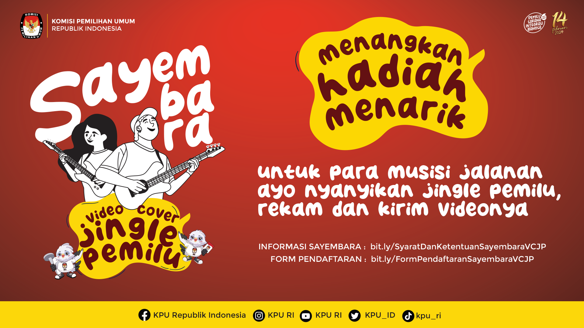 Medan, kota-medan.kpu.go.id - Komisi Pemilihan Umum Republik Indonesia melakukan Sayembara Video Cover Jingle Pemilu dengan mengajak musisi jalanan dari berbagai kalangan baik solo, duo maupun group. Untuk syarat dan ketentuan sayembara silahkan klik banner dibawah ini: