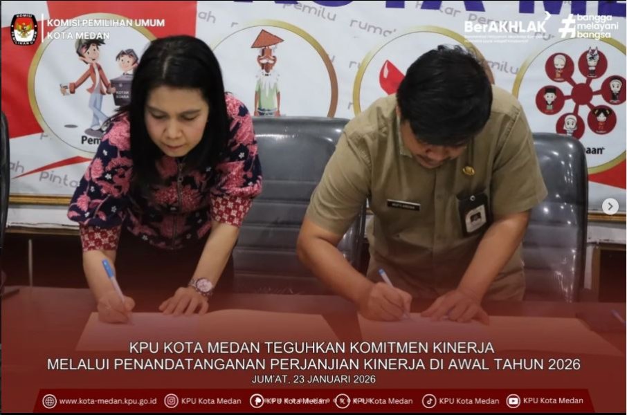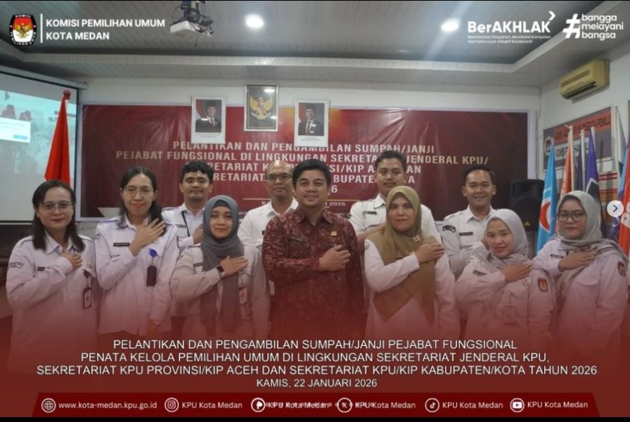 #TemanPemilih, sebanyak delapan orang pegawai di lingkungan Sekretariat KPU Kota Medan resmi dilantik dan diambil sumpah/janji sebagai Pejabat Fungsional Penata Kelola Pemilihan Umum. Peserta pelantikan adalah: 1.Tomita Juniarta Sitompul 2.Ira Nawang Wulan 3.Sondang Sherly Agustina 4.Erfira Karolina Tarigan 5.Bismi Wahyu Rianto 6.Arnando Arif Torotodo Gea 7.Irryn Irlanda Novenna Bukit 8.Bagus Hendro Dermawan Pelantikan tersebut merupakan bagian dari Pelantikan dan Pengambilan Sumpah/Janji Pejabat Fungsional Penata Kelola Pemilihan Umum di lingkungan Sekretariat Jenderal KPU, Sekretariat KPU Provinsi/KIP Aceh, serta Sekretariat KPU/KIP Kabupaten/Kota Tahun 2026, yang dilaksanakan secara daring melalui Zoom Meeting, Kamis (22/1/2026). Pelantikan dipimpin oleh Sekretaris Jenderal KPU Bernad Dermawan Sutrisno dan dihadiri Ketua KPU Mochammad Afifuddin. Dalam pesan pelantikannya, Sekretaris Jenderal KPU menegaskan peran strategis jabatan fungsional dalam mendukung kinerja KPU serta mendorong peningkatan etos kerja dan integritas seiring bertambahnya tanggung jawab, agar setiap tugas dapat dilaksanakan secara profesional, akuntabel, dan berorientasi pada pelayanan publik. Pada kesempatan itu, Ketua KPU Mochammad Afifuddin juga menambahkan bahwa pelantikan ini merupakan penerapan sistem merit serta bentuk apresiasi terhadap kinerja aparatur KPU, sekaligus mengajak seluruh jajaran bekerja secara ikhlas dan konsisten dalam mendukung penyelenggaraan pemilu yang berkualitas. Di lingkungan KPU Kota Medan, kegiatan tersebut turut dihadiri oleh Plt. Sekretaris KPU Kota Medan Mufti Ardian dan Kasubbag Partisipasi, Humas, dan SDM Ramdani Agustina Harahap. #KPUMelayani #KPUKotaMedan
