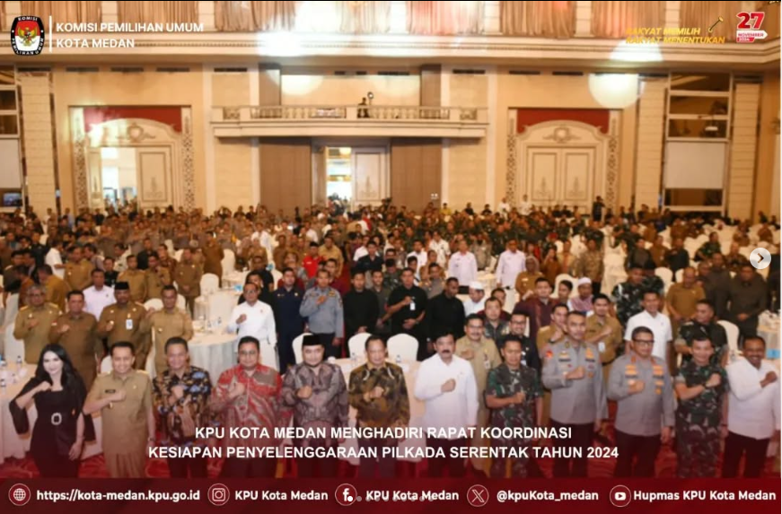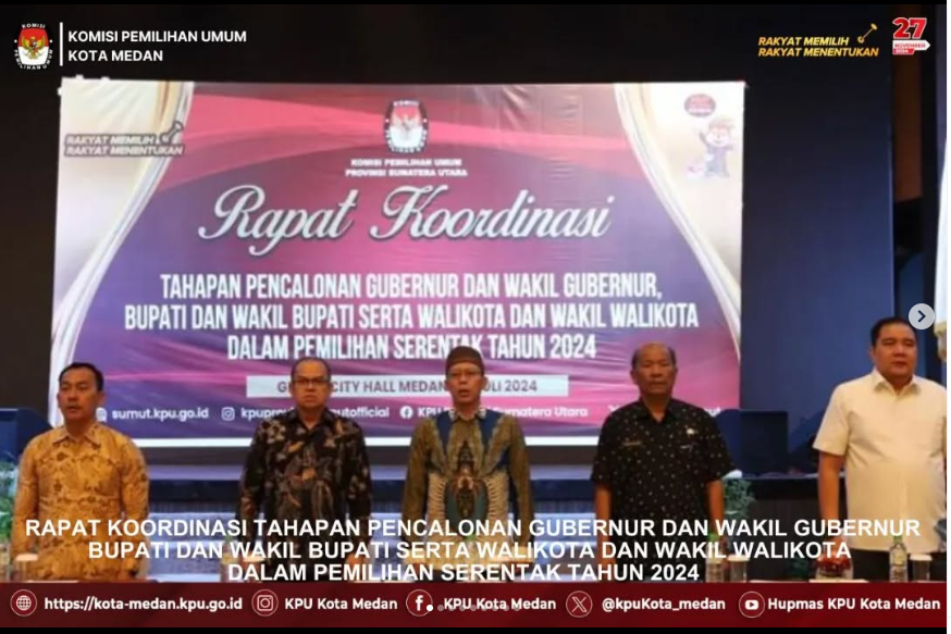 #TemanPemilih, KPU Kota Medan mengikuti Rapat Koordinasi Tahapan Pencalonan Gubernur dan Wakil Gubernur, Bupati dan Wakil Bupati Serta Walikota dan Wakil Walikota pada Pemilihan Serentak Tahun 2024 di Hotel Grand Aston City Hall Medan, Sabtu (13/07/24). Rakor dibuka oleh Ketua KPU Provinsi Sumatera Utara Agus Arifin didampingi oleh Anggota KPU Provinsi Sumatera Utara, Raja Ahab Damanik, El Suhaimi serta Sekretaris KPU Provinsi Sumatera Utara Sapran Daulay. Rapat koordinasi dihadiri juga oleh narasumber Kepala Biro Pemerintahan dan Otonomi Daerah Sekretariat Daerah Provinsi Sumatera Utara Harianto Butar-Butar, S.E., Pejabat Fungsional Ahli Madya Biro Pemerintahan dan Otonomi Daerah Provinsi Sumatera Utara Ahmad Rasyid Ritonga, AP, MM, dan Sekretaris Bappelitbang Provinsi Sumatera Utara, Dr. Dikky Anugerah, S.Sos., MSP. KPU Provinsi Sumatera Utara menyelenggarakan Rakor tersebut dalam rangka koordinasi antara KPU Provinsi Sumatera Utara dan KPU Kabupaten/Kota se-Sumatera Utara dengan Pemerintah Provinsi Sumatera Utara terkait kelengkapan administrasi pengusulan Calon Terpilih DPRD Provinsi dan DPRD Kabupaten/Kota pada Pilkada Serentak Tahun 2024. Dalam Rakor tersebut dibahas mengenai periodisasi masa jabatan Kepala Daerah dan Wakil Kepala Daerah, panduan penyusunan Visi, Misi dan Program Bakal Pasangan Calon serta mekanisme pencalonan Gubernur dan Wakil Gubernur, Bupati dan Wakil Bupati serta Walikota dan Wakil Walikota pada Pilkada Serentak Tahun 2024 Rakor dihadiri oleh Ketua KPU Kota Medan Mutia Atiqah, Anggota KPU Divisi Teknis Penyelenggaraan, Anggota KPU Divisi Hukum dan Pengawasan, Kasubbag Teknis Penyelenggaraan Pemilu, Partisipasi dan Hubungan Masyarakat serta Admin/Operator Silon dari KPU Kabupaten/Kota se-Sumatera Utara. Dari KPU Kota Medan, kegiatan tersebut dihadiri oleh Ketua KPU Kota Medan Mutia Atiqah, Anggota KPU Kota Medan Divisi Teknis Penyelenggaraan M. Taufiqurrohman Munthe, Anggota KPU Kota Medan Divisi Hukum dan Pengawasan Zefrizal, serta operator Silon KPU Kota Medan Sondang Sherly Agustina dan Ira Nawang Wulan. https://www.instagram.com/p/C9b6uRdSADC/?utm_source=ig_web_copy_link&igsh=MzRlODBiNWFlZA== #KPUMelayani #PilkadaSerentak2024