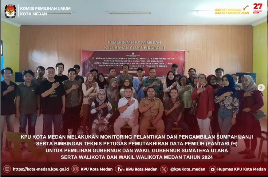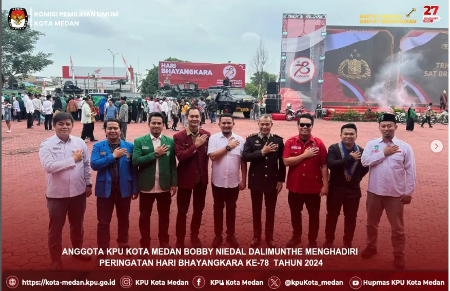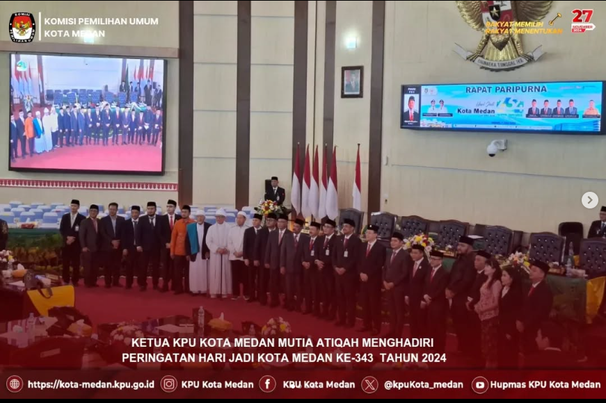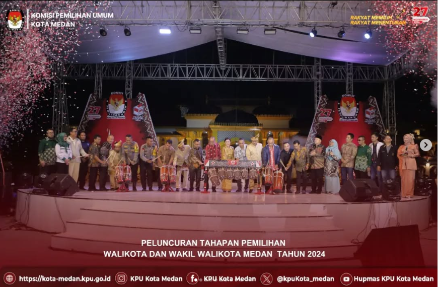 #TemanPemilih, KPU Kota Medan melaksanakan peluncuran tahapan Pemilihan Walikota dan Wakil Walikota Medan Tahun 2024 pada hari Sabtu (06/07/2024) di Lapangan Istana Maimoon Medan. Peluncuran secara resmi dibuka oleh Ketua KPU Kota Medan Mutia Atiqah didampingi oleh Anggota KPU Kota Medan. Pada peluncuran ini disampaikan bahwa pemungutan suara Pilkada Tahun 2024 jatuh pada tanggal 27 November 2024. Hadir pada peluncuran tersebut, Ketua KPU Provinsi Sumatera Utara Agus Arifin, Anggota KPU Sumatera Utara Kotaris Banurea, Kepala Badan Kesbangpol Kota Medan Andy Mario Siregar, unsur Forkopimda Kota Medan lainnya, Walikota Medan periode ke-17 Akhyar Nasution, perwakilan BIN Daerah Sumatera Utara, KPU Kabupaten/Kota se-Sumut, Komisioner KPU Kota Medan periode 2003 s.d 2023, Pimpinan Universitas di Sumatera Utara, Pimpinan Partai Politik di Kota Medan, tokoh masyarakat, tokoh agama, organisasi kepemudaan, organisasi masyarakat, media, dan Panitia Pemilihan Kecamatan (PPK) se-Kota Medan. https://www.instagram.com/p/C9KKRuzSlAW/?utm_source=ig_web_copy_link&igsh=MzRlODBiNWFlZA== #KPUmelayani #PemiluSerentak2024