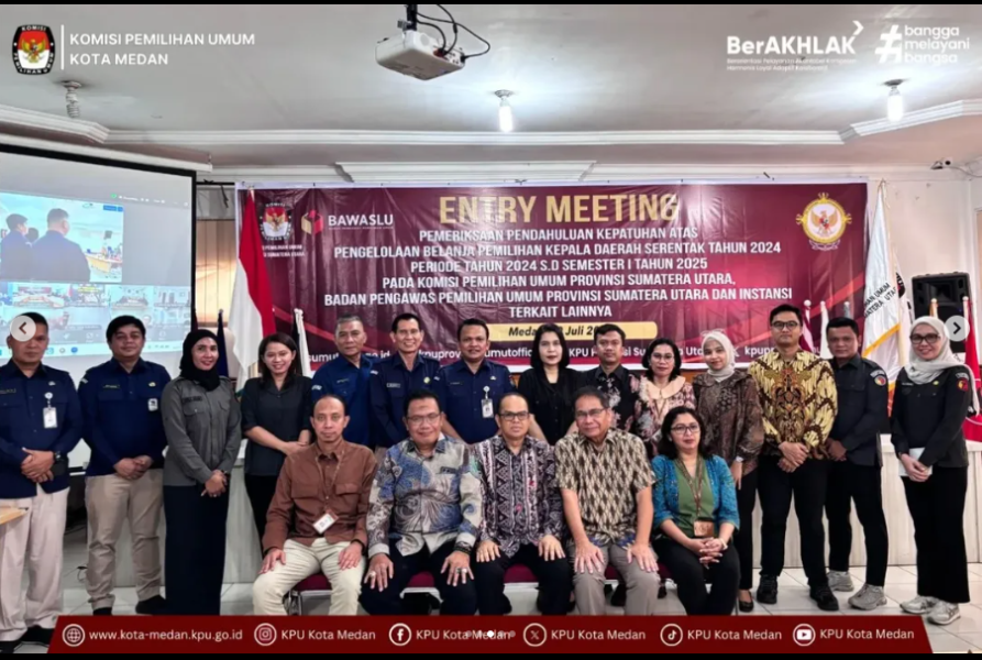 #TemanPemilih, Ketua KPU Kota Medan Mutia Atiqah, Sekretaris KPU Kota Medan Ahmad Nurdin, Kasubbag Keuangan, Umum dan Logistik Fadilla Rionanda Siregar beserta Bendahara dan staf Pengelola Keuangan KPU Kota Medan mengikuti kegiatan Entry Meeting bersama Badan Pemeriksa Keuangan (BPK) Perwakilan Provinsi Sumatera Utara Dalam Pemeriksaan Pendahuluan Kepatuhan Atas Pengelolaan Belanja Pemilihan Kepada Daerah Serentak Tahun 2024 periode Tahun 2024 s.d Semester I Tahun 2025 pada KPU Provinsi Sumatera Utara, Bawaslu Provinsi Sumatera dan Instansi Terkait Lainnya di Kantor KPU Provinsi Sumatera Utara, Selasa (29/07/2025).