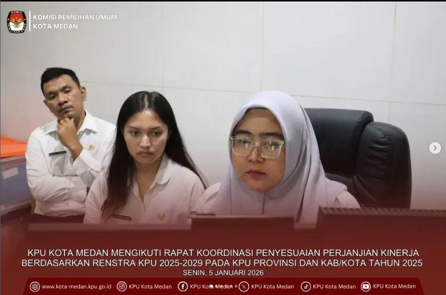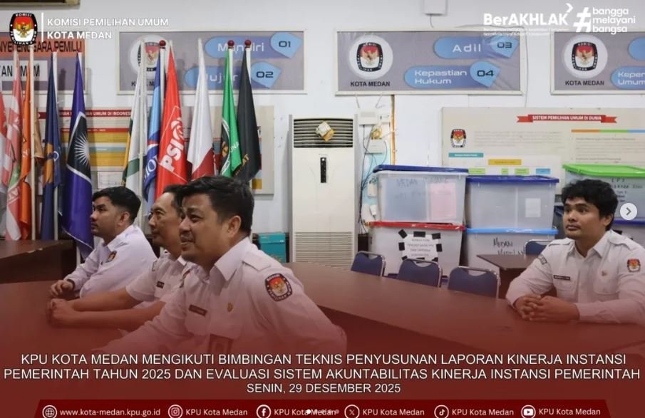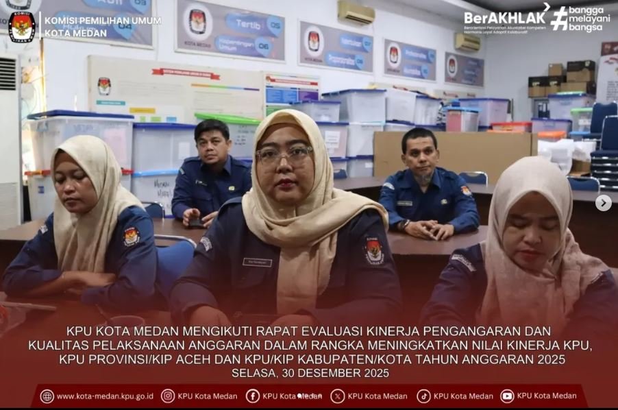 #TemanPemilih, KPU Kota Medan mengikuti Rapat Evaluasi Kinerja Penganggaran dan Kualitas Pelaksanaan Anggaran dalam rangka meningkatkan Nilai Kinerja Anggaran pada KPU, KPU Provinsi/KIP Aceh dan KPU/KIP Kabupaten/Kota Tahun Anggaran 2025 yang diselenggarakan oleh KPU RI secara daring, Selasa (30/12/2025).