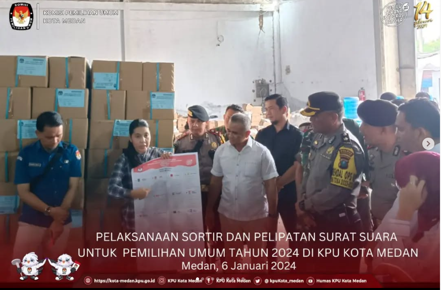 #TemanPemilih, KPU Kota Medan melakukan pensortiran dan pelipatan surat suara perdana untuk Pemilu Tahun 2024 bertempat di Gudang Logistik KPU Kota Medan Jl. K.L. Yos Sudarso KM. 9,8 Kel. Mabar, Kec. Medan Deli pada hari Sabtu (06/01/2024). Kegiatan pensortiran dan pelipatan surat suara ini turut disaksikan oleh Asisten Pemerintahan dan Kesejahteraan Rakyat Sekretariat Kota Medan M. Sofyan S.Sos, MAP, Kapolrestabes Medan diwakili oleh Kasat Samapta Polrestabes Medan Kompol Husni Mubarak Daulay, SH, S.IK, M.IK, Dandim 02/01 Medan Diwakili Lettu Yudo, Kapolres Pelabuhan Belawan diwakili oleh Kasat Intel Polres Pelabuhan Belawan AKP Zul Efendi, Kepala BIN Daerah Sumatera Utara diwakili Mayor Riki, Danlanud Soewondo Medan diwakili Mayor Cahya K.S, Danlantamal I Belawan diwakili Mayor Jantika, perwakilan dari Kejaksaan Negeri Medan dan Kejaksaan Negeri Belawan serta Ketua Bawaslu Kota Medan David Reynold beserta Anggota dan Sekretariat Bawaslu Kota Medan. Ketua KPU Kota Medan Mutia Atiqah menyampaikan bahwa pada proses pensortiran dan pelipatan surat suara, KPU Kota Medan mengerahkan sebanyak empat ratus warga sebagai petugas pensortir dan pelipat surat suara. Dalam proses penyortiran dan pelipatan surat suara, para pekerja harus mengikuti standar operasional prosedur (SOP) yang sudah ditetapkan. KPU Kota Medan sendiri baru menerima tiga jenis surat suara yaitu surat suara DPR RI, DPRD Provinsi dan DPRD Kota. Dengan demikian KPU Kota Medan masih harus menunggu tibanya surat suara Pilpres dan DPD. Surat suara ini nantinya akan dikirim bersama dengan logistik Pemilu lainnya untuk dikirim ke 6.933 Tempat Pemungutan Suara (TPS) yang tersebar di 151 Kelurahan dan 21 Kecamatan di Kota Medan. https://www.instagram.com/p/C1zXABhPgMb/?utm_source=ig_web_copy_link&igsh=MzRlODBiNWFlZA== #KPUMelayani #PemiluSerentakTahun2024