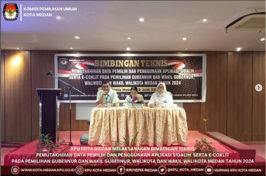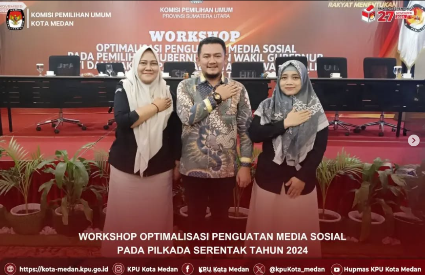 #TemanPemilih, KPU Kota Medan mengikuti kegiatan Workshop Optimalisasi Penguatan Media Sosial pada Pemilihan Gubernur dan Wakil Gubernur, Bupati dan Wakil Bupati, Walikota dan Wakil Walikota pada Pilkada Serentak Tahun 2024 yang diselenggarakan oleh KPU Provinsi Sumatera Utara bertempat di Hotel Emerald Garden Medan, pada hari Rabu & Kamis (12-13/06/2024). Workshop dibuka oleh Plh. Ketua KPU Provinsi Sumatera Utara Robby Effendi didampingi Anggota KPU Provinsi Sumatera Utara, Sitori Mendrofa dan Elsuhaimi, Pejabat Fungsional Ahli Madya KPU Provinsi Sumatera Utara, Evy Ratimah Hafsah, Kasubbag Partisipasi dan Hubungan Masyarakat, Rina Zuraina serta jajaran Sekretariat KPU Provinsi Sumatera Utara, serta Peserta dari KPU Kabupaten/Kota Se-Sumatera Utara. Kegiatan tersebut diikuti oleh Anggota KPU Kota Medan Divisi Sosialisasi Pendidikan Pemilih dan Partisipasi Masyarakat dan SDM KPU Kota Medan Bobby Niedal Dalimunthe, Kasubbag Teknis Penyelenggaraan Pemilu, Partisipasi, dan Hubungan Masyarakat, Fatimah Hanim dan Staf Teknis dan Parhubmas KPU Kota Medan.https://www.instagram.com/p/C8JjxPqS79p/?utm_source=ig_web_copy_link&igsh=MzRlODBiNWFlZA== #KPUMelayani #PilkadaSerentak2024 #KPUKotaMedan