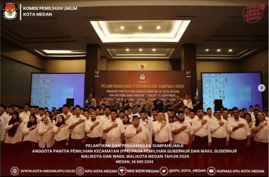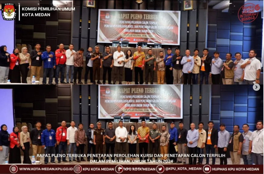 #TemanPemilih, Komisi Pemilihan Umum Kota Medan telah melaksanakan Rapat Pleno Penetapan Perolehan Kursi dan Penetapan Calon terpilih Anggota DPRD Kota Medan dalam Pemilihan Umum Tahun 2024 bertempat di Hotel Le Polonia Medan pada Selasa, (28/5/2024). Acara tersebut dibuka secara resmi oleh Ketua KPU Kota Medan, Mutia Atiqah, kemudian dilanjutkan dengan Pembacaan Berita Acara dan Surat Keputusan Penetapan Perolehan Kursi dan Penetapan Calon Terpilih Anggota DPRD Kota Medan dalam Pemilihan Umum Tahun 2024. Acara dilanjutkan dengan Penandatangan Berita Acara dan Surat Keputusan Penetapan beserta penyerahan Salinan Keputusan Penetapan Perolehan Kursi dan Calon Terpilih Anggota DPRD Kota Medan pada Pemilu Tahun 2024 kepada Bawaslu Kota Medan dan Partai Politik Peserta Pemilu Tahun 2024 di Kota Medan. Turut hadir dalam acara tersebut, Perwakilan Polrestabes Medan, Dandim 02/01 Medan, Perwakilan Kejaksaan Negeri Medan, Perwakilan Polres Pelabuhan Belawan, Perwakilan Kejaksaan Negeri Belawan, Perwakilan BIN Daerah Sumatera Utara serta rekan-rekan dari media massa di Kota Medan. Acara berjalan dengan tertib dan lancar dan diakhiri dengan sesi foto bersama.https://www.instagram.com/p/C7mY6Q3SS3B/?utm_source=ig_web_copy_link&igsh=MzRlODBiNWFlZA== #KPUMelayani #Pemiluserentak2024