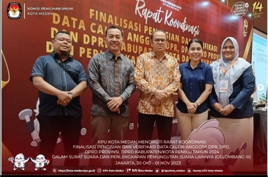 #TemanPemilih, Ketua KPU Kota Medan Mutia Atiqah, Anggota KPU Kota Medan Divisi Teknis Penyelenggaraan M. Taufiqurrohman Munthe serta Kasubbag Teknis Penyelenggaraan Pemilu, Partisipasi dan Hubungan Masyarakat Kota Medan Fatimah Hanim mengikuti Rapat Koordinasi Finalisasi Pengisian dan Verifikasi Data Calon Anggota DPR, DPD, DPRD Provinsi, dan DPRD Kabupaten/Kota Pemilu Tahun 2024 dalam Surat Suara dan Perlengkapan Pemungutan Suara Lainnya (Gelombang III) di Jakarta, Senin - Rabu (30 Oktober - 1 November 2023).