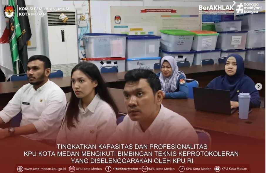 #TemanPemilih, KPU Kota Medan mengikuti Bimbingan Teknis Keprotokoleran yang diselenggarakan oleh KPU RI sebagai upaya penguatan kapasitas dan peningkatan profesionalitas dalam penyelenggaraan acara resmi di lingkungan Komisi Pemilihan Umum, Selasa (25/11/2025).