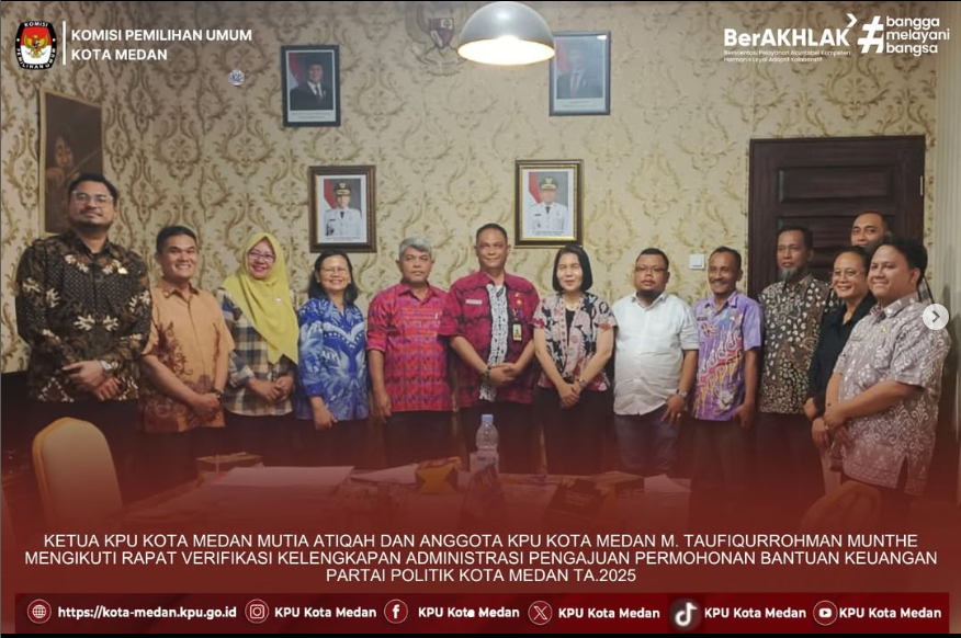 #Teman Pemilih, Ketua KPU Kota Medan Mutia Atiqah dan Anggota KPU Kota Medan M. Taufiqurrohman Munthe didampingi staf Subbag Teknis dan Hukum Sondang Sherly Agustina mengikuti Rapat verifikasi kelengkapan administrasi pengajuan permohonan bantuan keuangan Partai Politik Kota Medan TA.2025 bertempat di ruang rapat Badan Kesatuan Bangsa dan Politik Kota Medan Jl. Jend. Abdul Haris Nasution No. 17 Medan, Kamis (15/05/2025).
