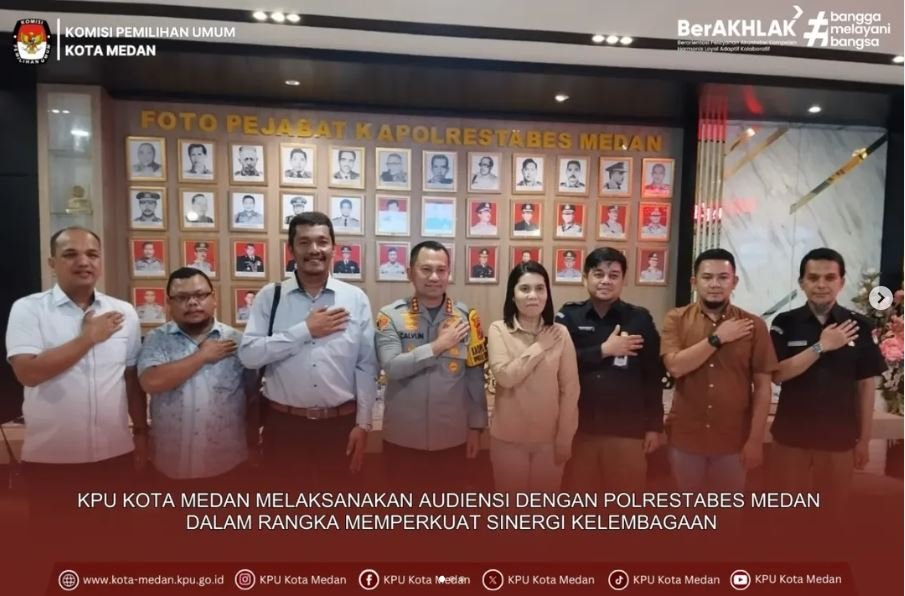 #TemanPemilih, Komisi Pemilihan Umum (KPU) Kota Medan melaksanakan audiensi dengan Polrestabes Medan sebagai bagian dari upaya penguatan sinergi kelembagaan dalam mendukung pelaksanaan tugas non-tahapan kepemiluan secara efektif, profesional, dan sesuai dengan ketentuan peraturan perundang-undangan, Rabu (19/11/2025).