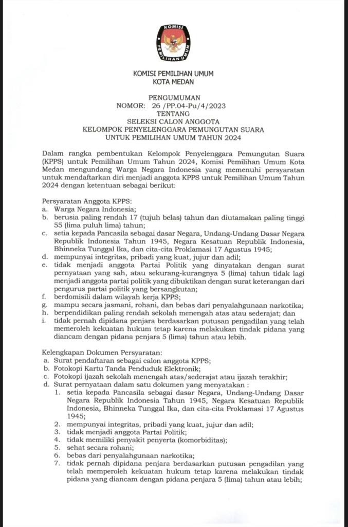 #TemanPemilih, berikut disampaikan Pengumuman KPU Kota Medan Nomor: 26/PP.04-Pu/4/2023 Tentang Seleksi Calon Anggota Kelompok Penyelenggara Pemungutan Suara Untuk Pemilihan Umum Tahun 2024.