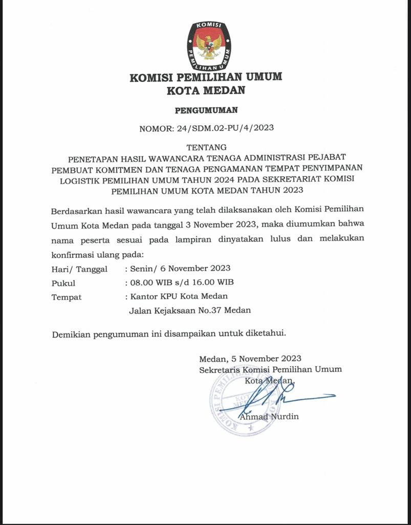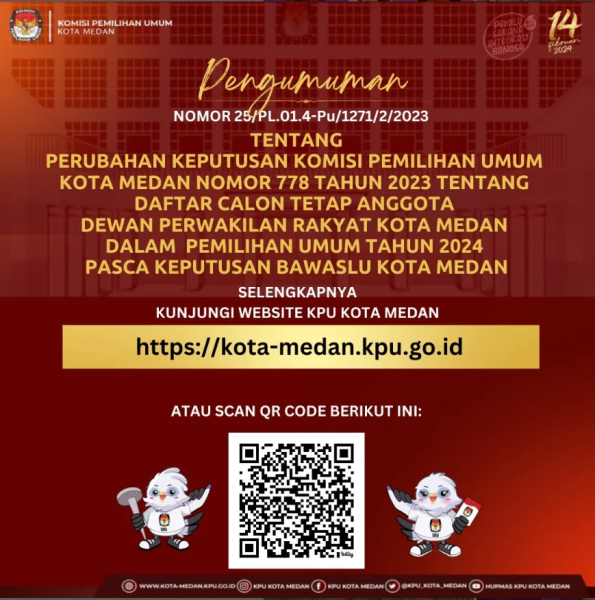 #TemanPemilih, berikut disampaikan Pengumuman KPU Kota Medan Nomor 25/PL.01.4-Pu/1271/2/2023 Tentang Perubahan Keputusan Komisi Pemilihan Umum Kota Medan Nomor 778 Tahun 2023 Tentang Daftar Calon Tetap Anggota Anggota Dewan Perwakilan Rakyat Kota Medan Dalam Pemilihan Umum Tahun 2024 Pasca Keputusan Bawaslu Kota Medan