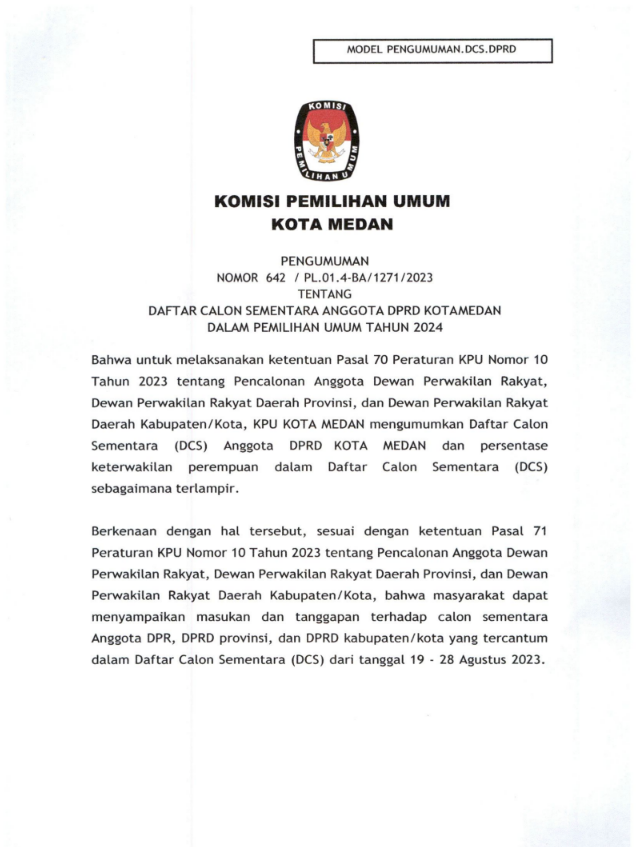 Bahwa untuk melaksanakan ketentuan Pasal 70 Peraturan KPU Nomor 10 Tahun 2023 tentang Pencalonan Anggota Dewan Perwakilan Rakyat, Dewan Perwakilan Rakyat Daerah Provinsi, dan Dewan Perwakilan Rakyat Daerah Kabupaten/Kota, KPU KOTA MEDAN mengumumkan Daftar Calon Sementara (DCS) Anggota DPRD KOTA MEDAN dan persentase keterwakilan perempuan dalam Daftar Calon Sementara (DCS) sebagaimana terlampir.