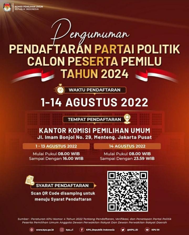 PENGUMUMAN NOMOR 7/PL.01.1-Pu/05/2022 TENTANG PENDAFTARAN PARTAI POLITIK CALON PESERTA PEMILU TAHUN 2024 <<< KLIK DISINI