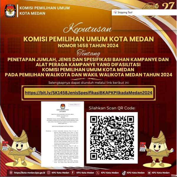 #TemanPemilih, berikut disampaikan Keputusan Komisi Pemilihan Umum Kota Medan Nomor 1458 Tahun 2024 Tentang Penetapan Jumlah, Jenis Dan Spesifikasi Bahan Kampanye Dan