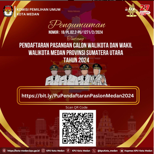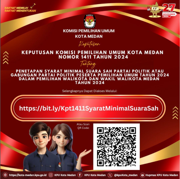 #TemanPemilih, berikut disampaikan Keputusan Komisi Pemilihan Umum Kota medan Nomor 1397 Tahun 2024 Tentang Perubahan Atas Keputusan Komisi Pemilihan Umum Kota Medan Nomor 1354 Tahun 2024 Tentang Syarat Minimal Jumlah Kursi Atau Jumlah Suara Sah Sebagai Syarat Pencalonan Pasangan Calon Dari Partai Politik Atau Gabungan Partai Politik Dalam Pemilihan Walikota dan Wakil Walikota Medan Tahun 2024.