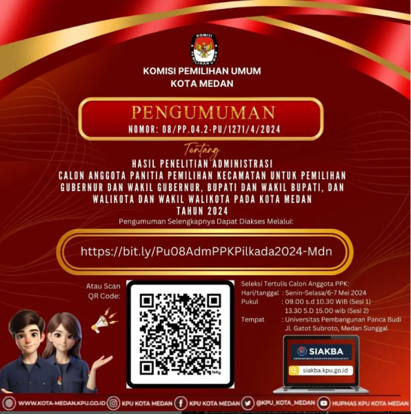 #TemanPemilih, berikut kami sampaikan Pengumuman No. 08/PP.04.2-PU/1271/2024 Tentang Hasil Penelitian Administrasi Calon Anggota Panitia Pemilihan Kecamatan Untuk Pemilihan Gubernur dan Wakil Gubernur, Bupati dan Wakil Bupati, Dan Walikota dan Wakil Walikota pada Kota Medan Tahun 2024.