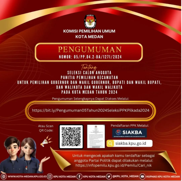 #TemanPemilih, berikut disampaikan Pengumuman KPU Kota Medan Nomor 05/PP.04.2-BA/1271/2024 Tentang Seleksi Calon Anggota Panitia Pemilihan Kecamatan Untuk Pemilihan Gubernur dan Wakil Gubernur, Bupati dan Wakil Bupati, Dan Walikota dan Wakil Walikota Pada Kota Medan Tahun 2024.